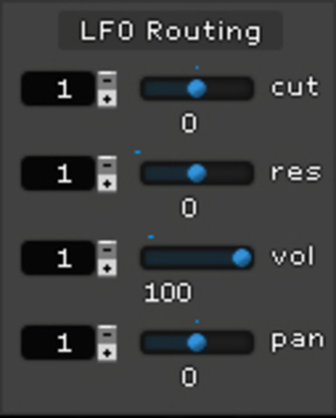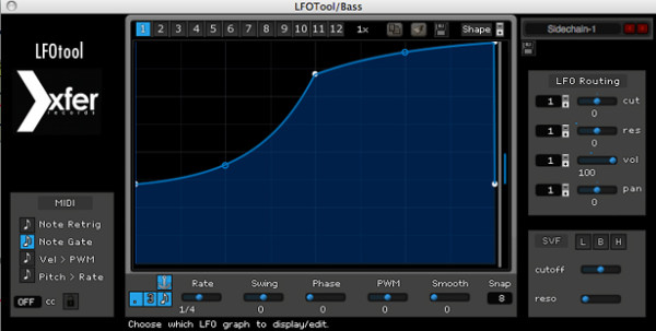 At the top of the plugin window you’ll notice numbers 1-12. Each of these is a separate graph that can be assigned to control, cutoff, resonance, panning and volume. You could, for example, route graph 1 to cutoff and graph 2 to pan by simply toggling the numbers next to cut, res, vol on the right of the plugin. Move the blue slider to the right to engage the graph to your volume, etc. You can achieve some very interesting and intricate effects with these types of layered routings.