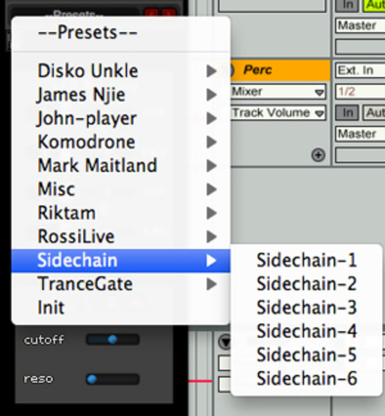 Step 4: In the upper RH Corner of the plug in you’ll see a preset tab. Click and drag down to select the side-chain presets. Here I’m selecting sidechain-1.
