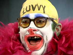 We Live in Public is what you would get if you took the conceptual underpinnings of the Matrix series, seasoned it with Orwell’s 1984 and added a shot of MTV’s Jersey Shore. It centers on humanity at the cusp of a machine revolution, attempting to maintain meaningful connections under the pressure of impending technological singularity as wires and screens supplant veins, arteries and eyes. At the forefront of mankind’s last stand is one individual who saw it all coming, a Neo or Winston Smith-type protagonist with the earnest intention to liberate the blind masses through the exploitation of the devices that would inevitably strip him of his own identity. There is also a clown with an atrocious makeup job and an obnoxious voice, rivaling that of Snooki. His name is Luvvy. He is the hero-protagonist. And it’s a documentary.