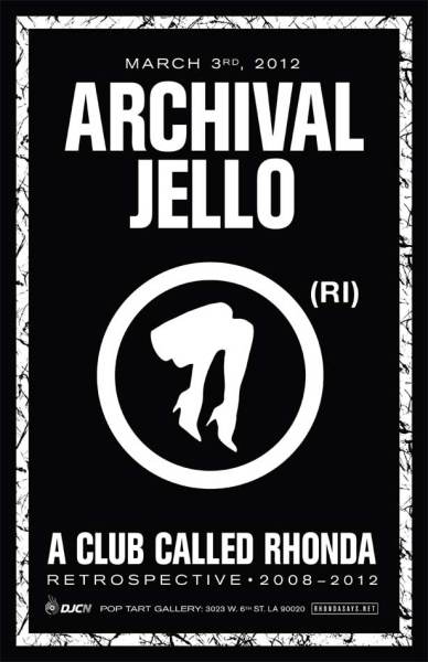 The producers of LA club night, A Club Called Rhonda, are putting together a retrospective show at the Pop tART gallery. “Archival Jello: A Club Called Rhonda Retrospective: 2008 – 2012” is being put on in association with web based television network, DJCN—DJ Club Network. Opening reception is on Saturday, March 3rd from 7:00 – 11:00 pm and runs through April 5th.