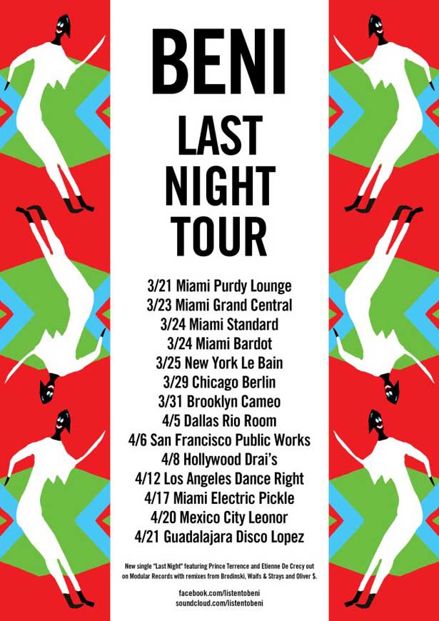 Modular artist Beni will no doubt be dropping this one as he bounces around the US for an extensive run of dates. He has a bunch of shows during next week’s Winter Music Conference in Miami and he’ll also be taking a quick jaunt to Mexico. The Beni tour is in support of his new single “Last Night” featuring Etienne De Crecy and Prince Terrence, which will be out late April via Modular Recordings. We hear that there will be more “Last Night” remixes from Oliver $ and Waifs & Strays dropping pretty soon as well. And if you haven’t heard Beni’s debut album House Of Beni we highly recommend it. The album features collaborations with Nomi Ruiz (Hercules & Love Affair), Sam Sparro, Mattie Safer and Via Tania. You can pick it up via Modular Recordings or iTunes here.