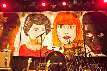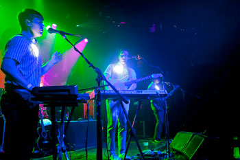 On their catchiest single, “The Bay” UK indie-pop quartet Metronomy ask seductively, “You may have the body, but do you have the song?” Playing to a sold out crowd at Irving Plaza on Friday night, they answered, “Yes” over and over during a brisk, tight set. Backed by giant coloring book posters of each member, they came across like hyper-animated kin to the Tom Tom Club. What Tina Weymouth’s pigtails and bass are to TTC, Anna Prior’s bangs and drums are to Metronomy: rhythmic anchors for the band’s rolling grooves. Heirs to post-punk and no wave’s amorphous rhythms, Metronomy are also children of the electronic revolution and acid house is woven equally deeply into their DNA. All these influences popped up at different points through out the night as they bumped their way though favorites like “Heartbreaker,”“A Thing For Me,”“The End of You Too,” and “Everything Goes My Way” from the albums Night Out (2008) and The English Riviera (2011). If there’s anything that needs improvement it is the sequencing and finesse with which they take the audience through these influences in their music. While they never sounded disjointed or off base, the center wobbled loose at a few points throughout the night. This “meandering” charmed a room the size of Irving Plaza, but as the tour winds its way across the US, Metronomy might do well to polish up how they move from the shoegaze tip to the nu-disco edge of their radiant sonic spectrum. Do not doubt, however, that Metronomy are literally destined for bigger stages—in the next few weeks, they will be hitting Coachella and opening for Coldplay. Catch them now if you can, or be prepared for longer lines next year.