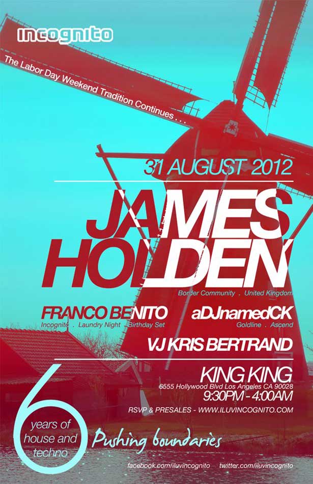 “Incognito has always stood for amazing, cutting-edge house and techno the last six years. That is the reason why more than half of our 300+ events involve bringing in DJs for their first LA appearance. Some call it risky, we call it pushing the envelope of dance music in Los Angeles. And a perfect example of that is Border Community head James Holden. His music and DJ sets are just so different from most everyone, and he takes risks while taking us on musical journeys like no one else, marrying shoegaze, electronica, psychedelic techno and more into one set. That’s what we call amazing cutting edge dance music,” said Incognito co-founder Alan Agbayani.