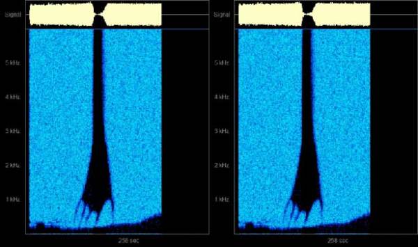 While examining the image, I came to the conclusion that something was not right. So I started messing around with the settings of the spectrograph program, and after a bit of knob twiddling the mystery revealed itself: the face was supposed to be watched with a logarithmic frequency scale, not with a linear scale.