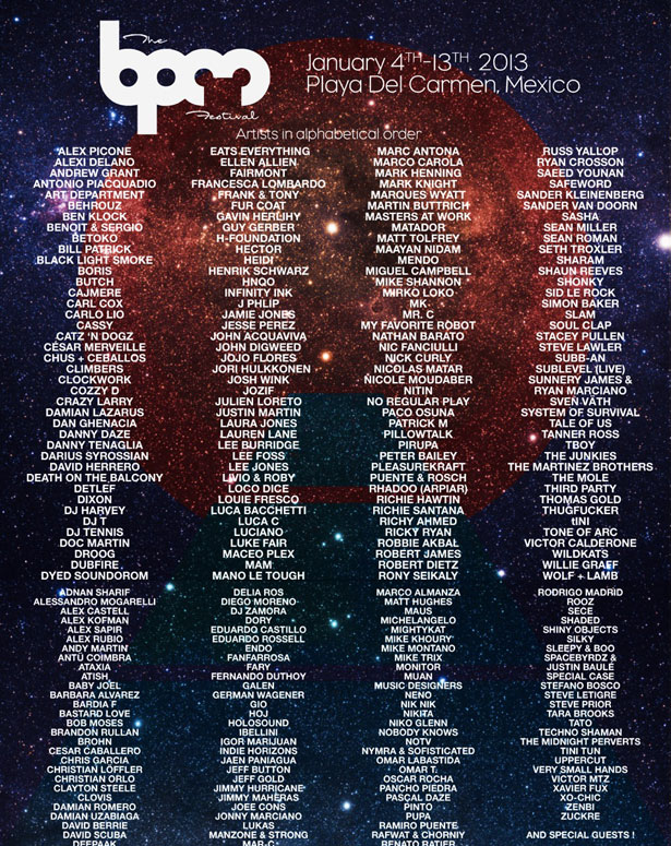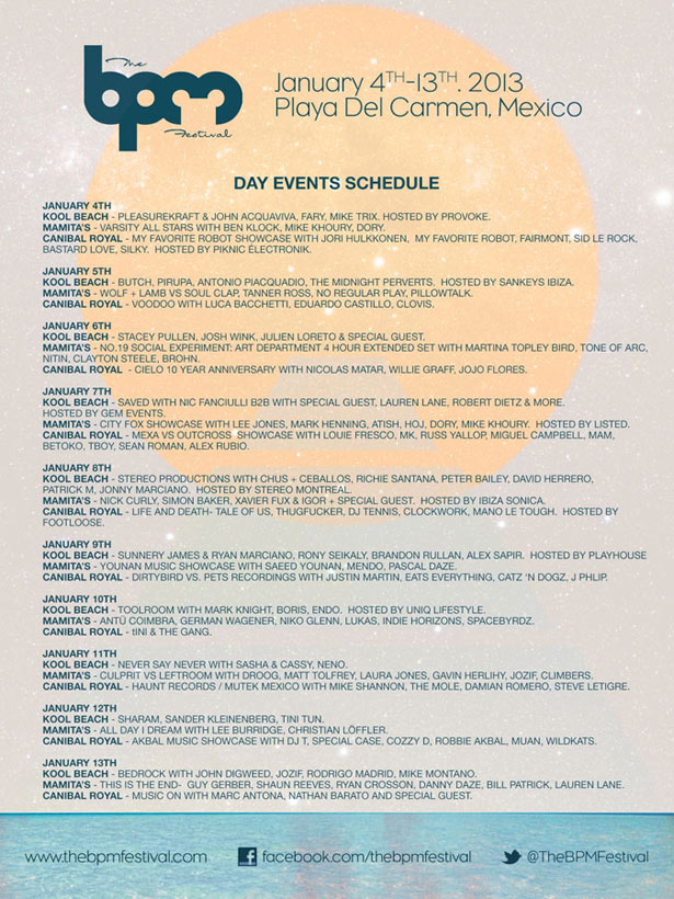 Six years running and I still haven’t been. One of these years, dammit. If you are going to the BPM Festival they just announce the phase 2 lineup and Day & Night events schedule in and around Playa del Carmen, Mexico from January 4 to 13, 2013. Over 250 artists confirmed to perform, which is crazy nuts—talk about an EDM culture lover’s winter holiday bonanza.