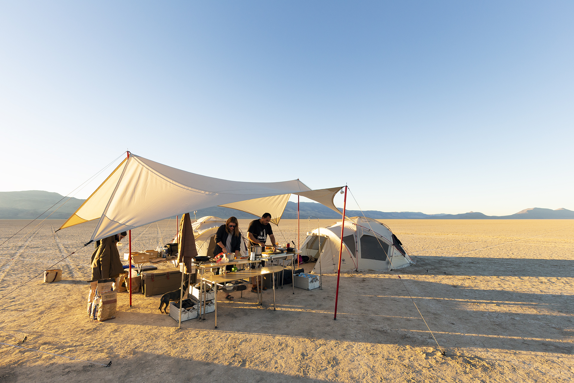 The Land Station Ivory is a large tarp that can comfortably accommodate six to eight people and serve as either a sleeping or living space. It will cost $999.55 and poles are not included.
