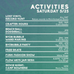 Try the Parkour Workshop by Paulie on Sunday, and ‘HIIT’ (high-intensity interval training) class by Ash and Em on Saturday. Also, check out the “SUP” (stand-up paddleboard yoga) classes on the lake!
