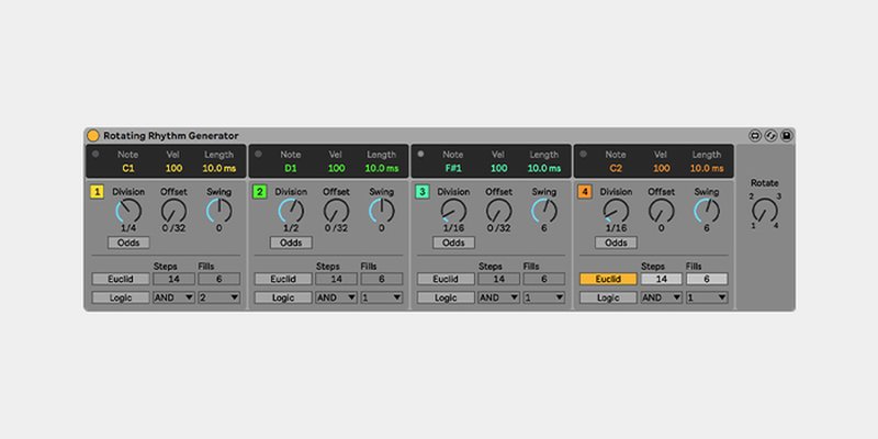 Rotating Rhythm Generator: Create organic rhythms and experiment with modular-style beat and polyrhythm generation. This device also sends MIDI so you can use it with Drum Racks or other external equipment with a MIDI input.