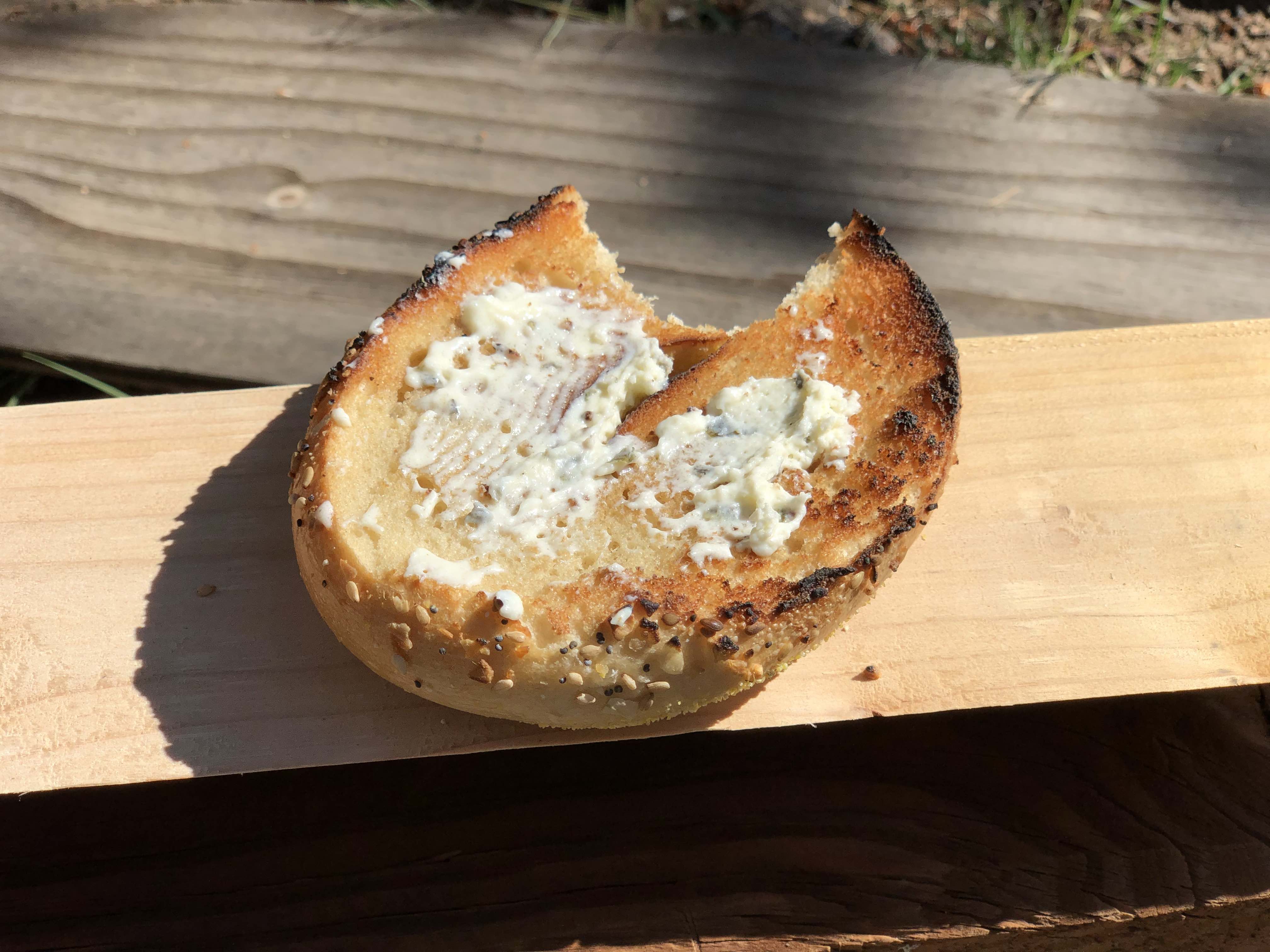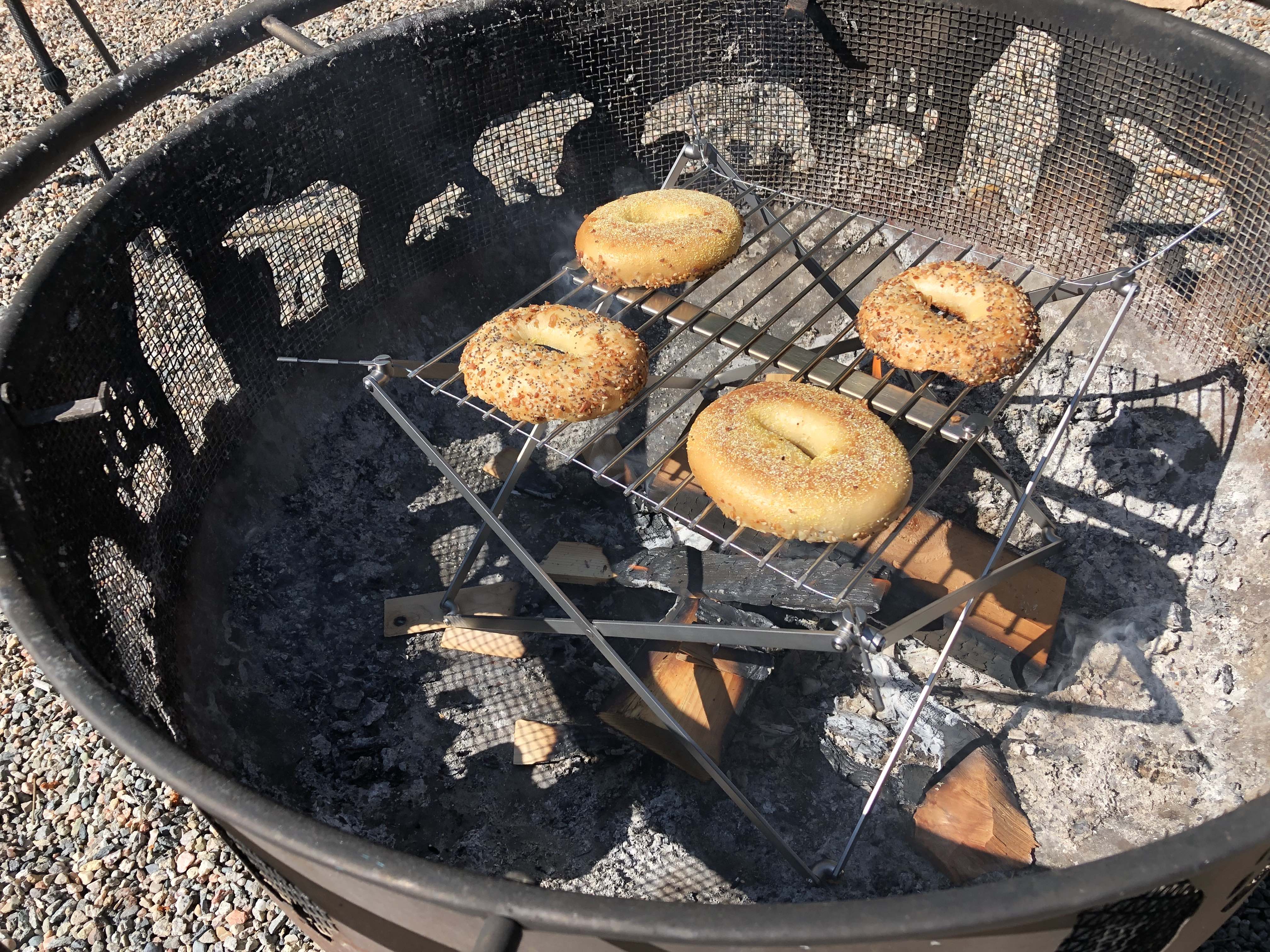 Breakfast consisted of some bagels from a local bakery with some scallions and cream cheese. We kept the fire small and focused, and the grill at the highest setting, which is 8″ from the ground so we could get a nice toast and not scorch our bread. About 5 mins on a low to medium heat yielded a delicious crunch, and we were able to get two rotations done with ease. Nothing quite matches the taste of a fresh bagel toasted over a wood fire – it’s delicious.