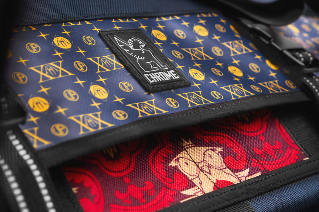 The limited edition Citizen messenger bags were handmade by Chrome bag makers in Chicago and San Francisco. They feature a custom tarp liner printed with Upper Playground’s 20th anniversary logo pattern, a 20th anniversary patch, and an inside panel with Jeremy Fish’s “Fowl Mood” owl wallpaper, which calls back to Chrome’s 2009 Artist Series bags with Upper Playground featuring the work of Jeremy Fish and Sam Flores.