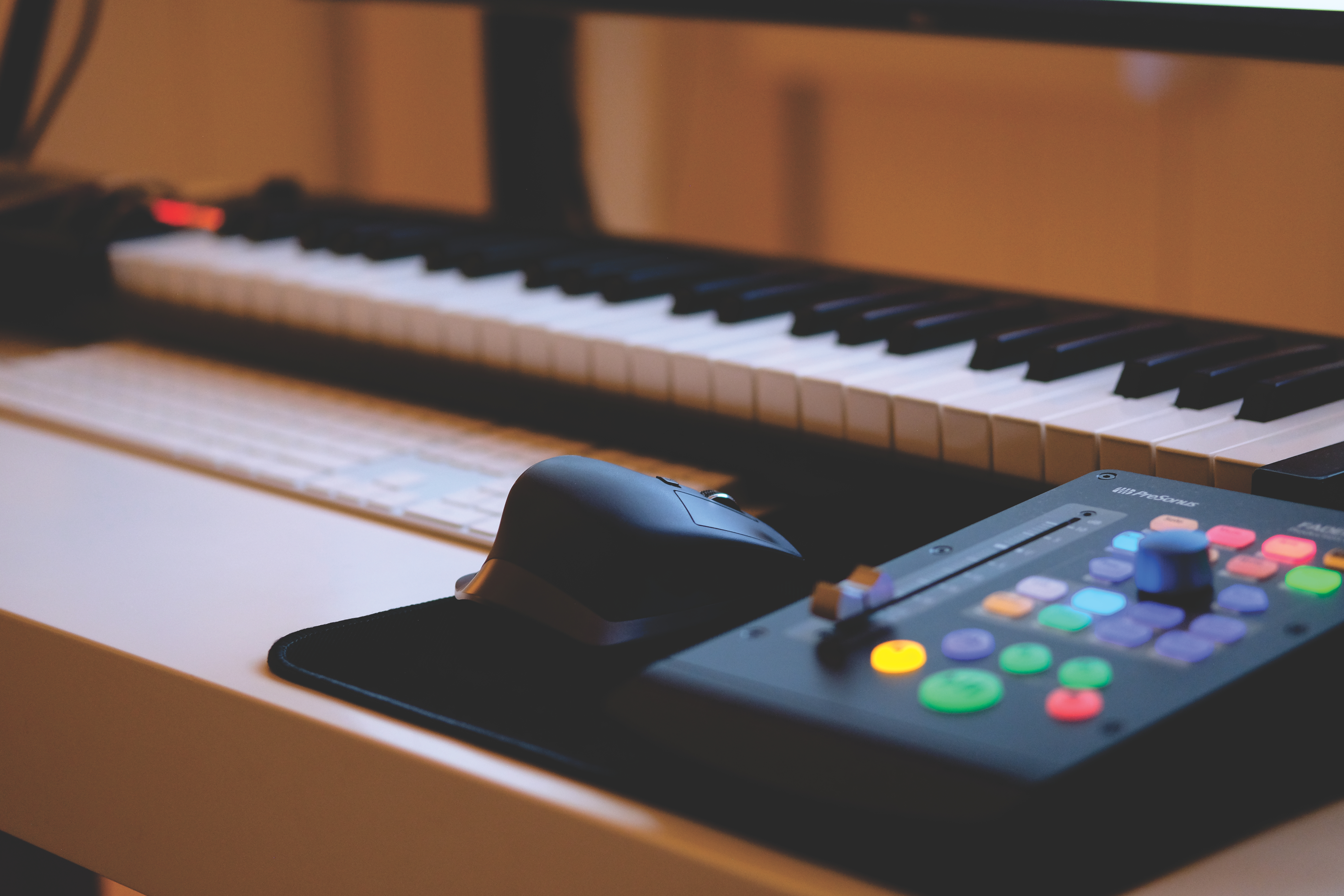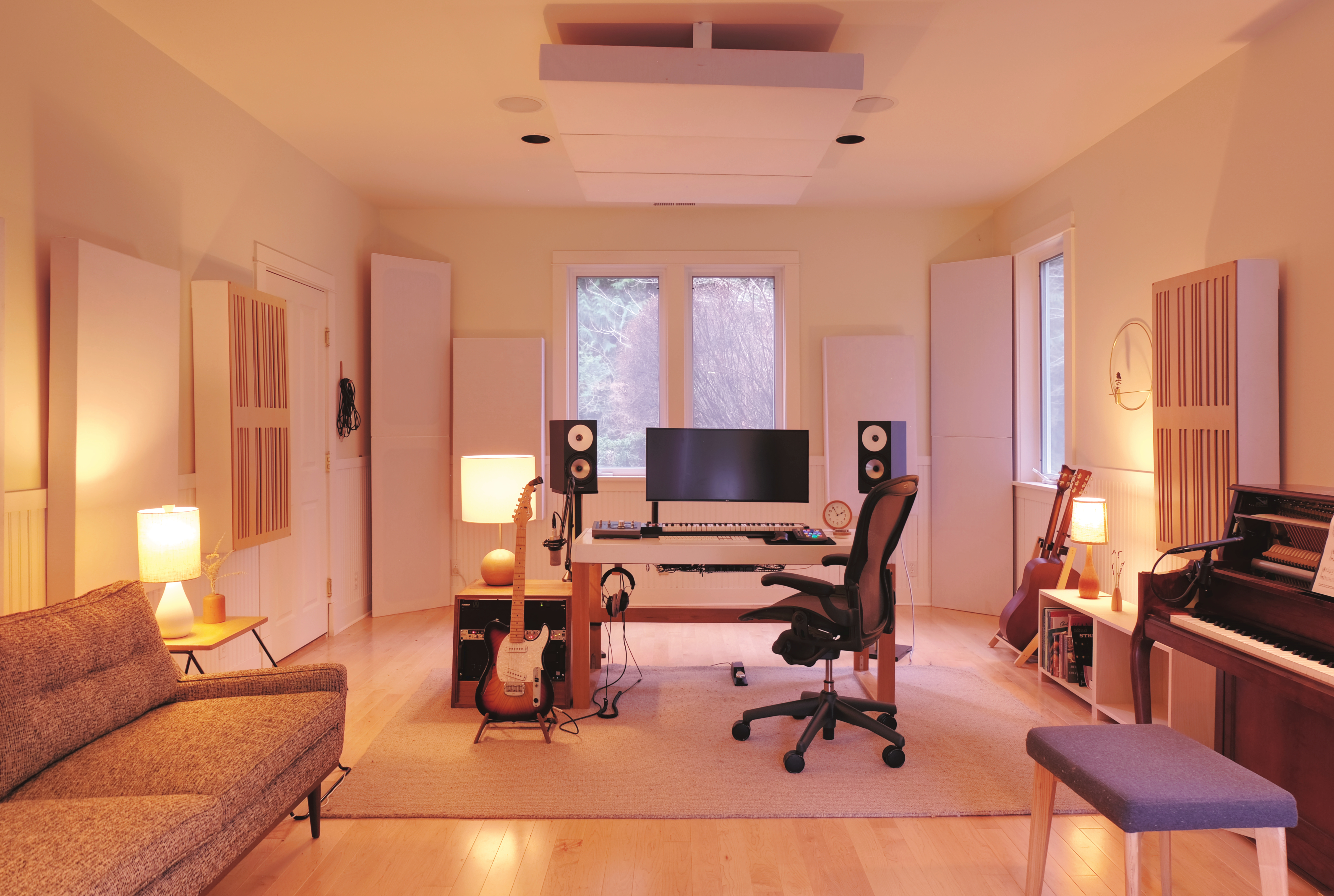 We keep our studio pretty simple. I learned to make electronic music with very little, doing a lot with software, so I do not own a lot of hardware gear. The visual clutter of too many knobs and options serves to distract me from the creative process, so I tend to stick with options for each functional purpose and use them almost exclusively. Our studio is a gathering place for us and our family, so we aim to make it functional and inviting. We recorded everything ourselves here.