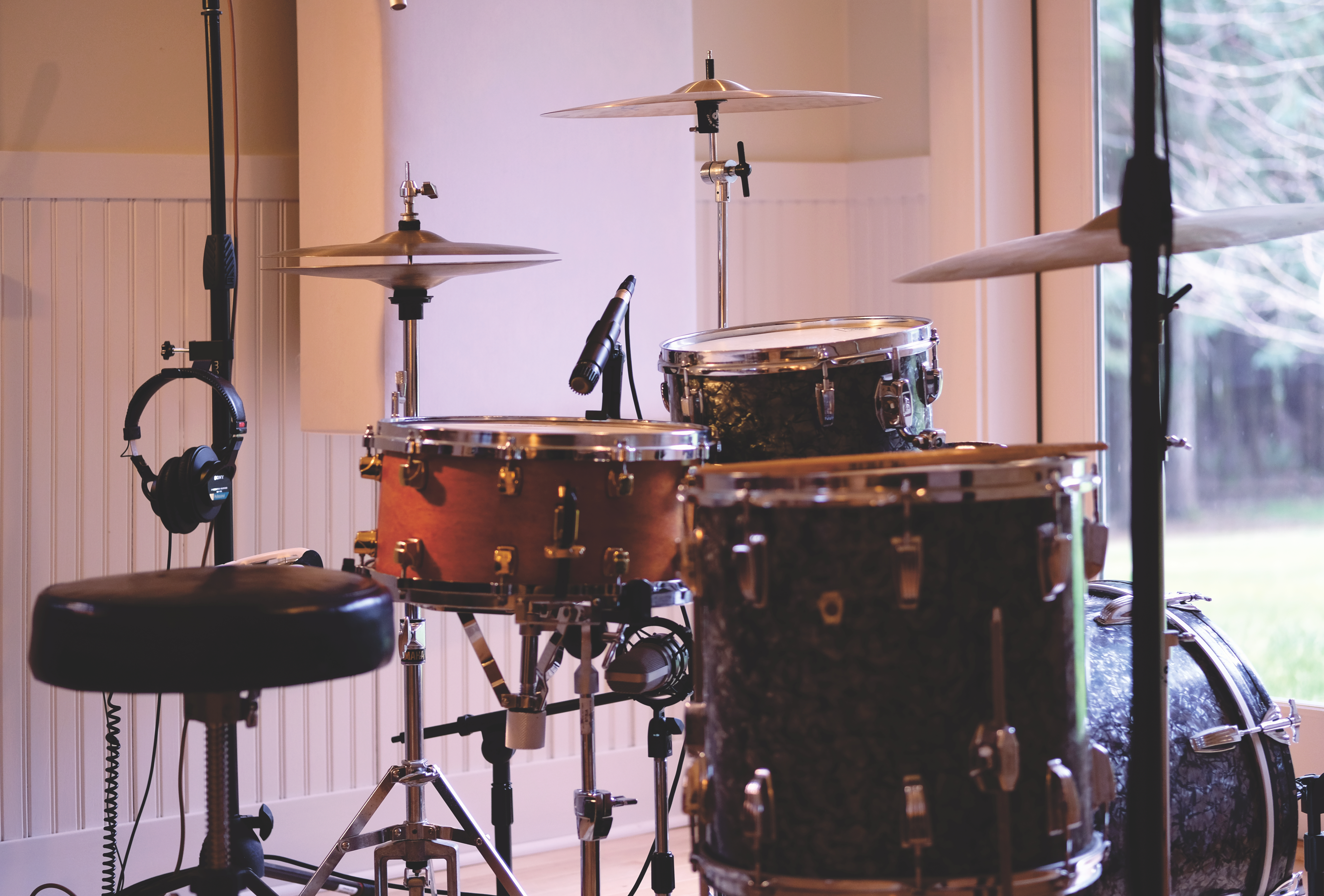 For drums, I have a Ludwig jazz kit from the 60’s with a Yamaha custom vintage snare with old K Istanbul hi hats, a 20” Zyn ride from the 60’s and a 17” Istanbul Xist crash. These are mic’d by a pair of Rode N5’s on overheads, SM57 for top snare, BETA 52 for the kick inside, AT4047A for the outside kick and bottom snare.
