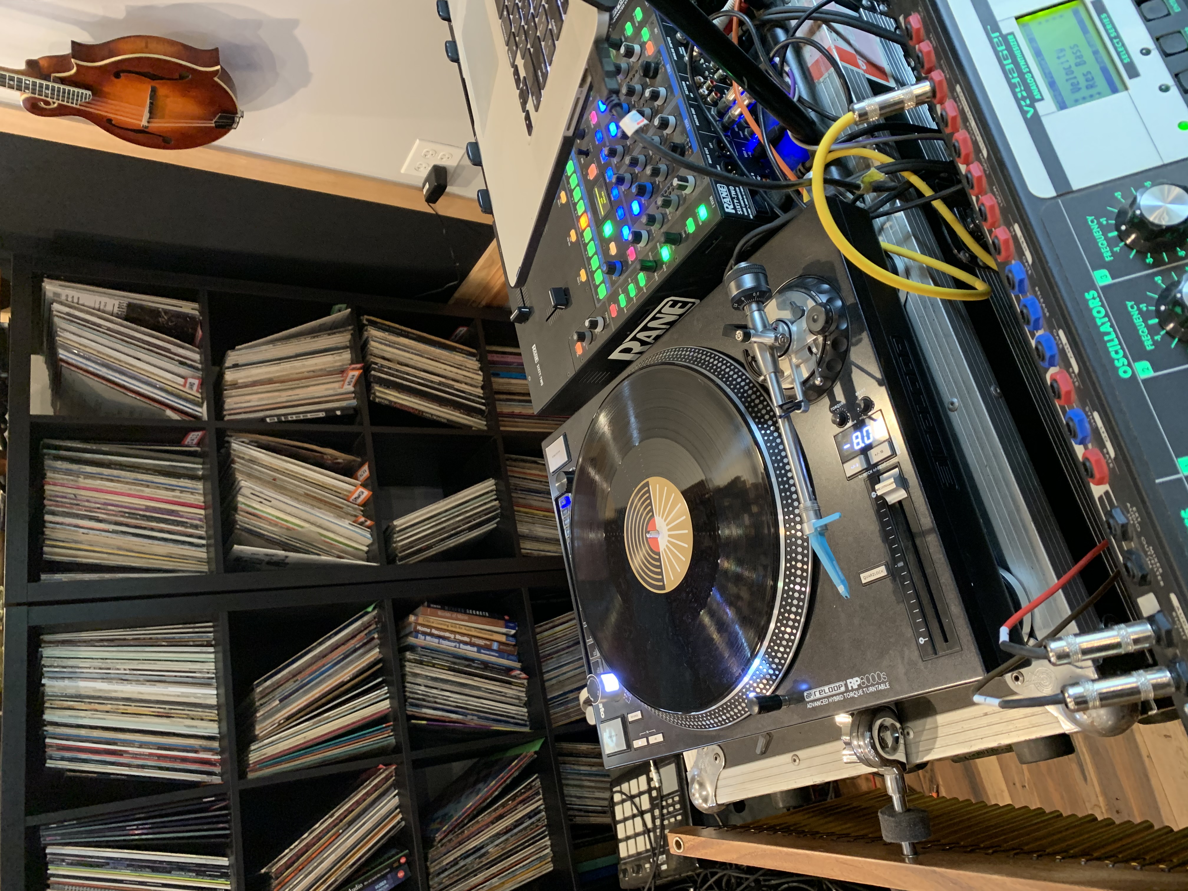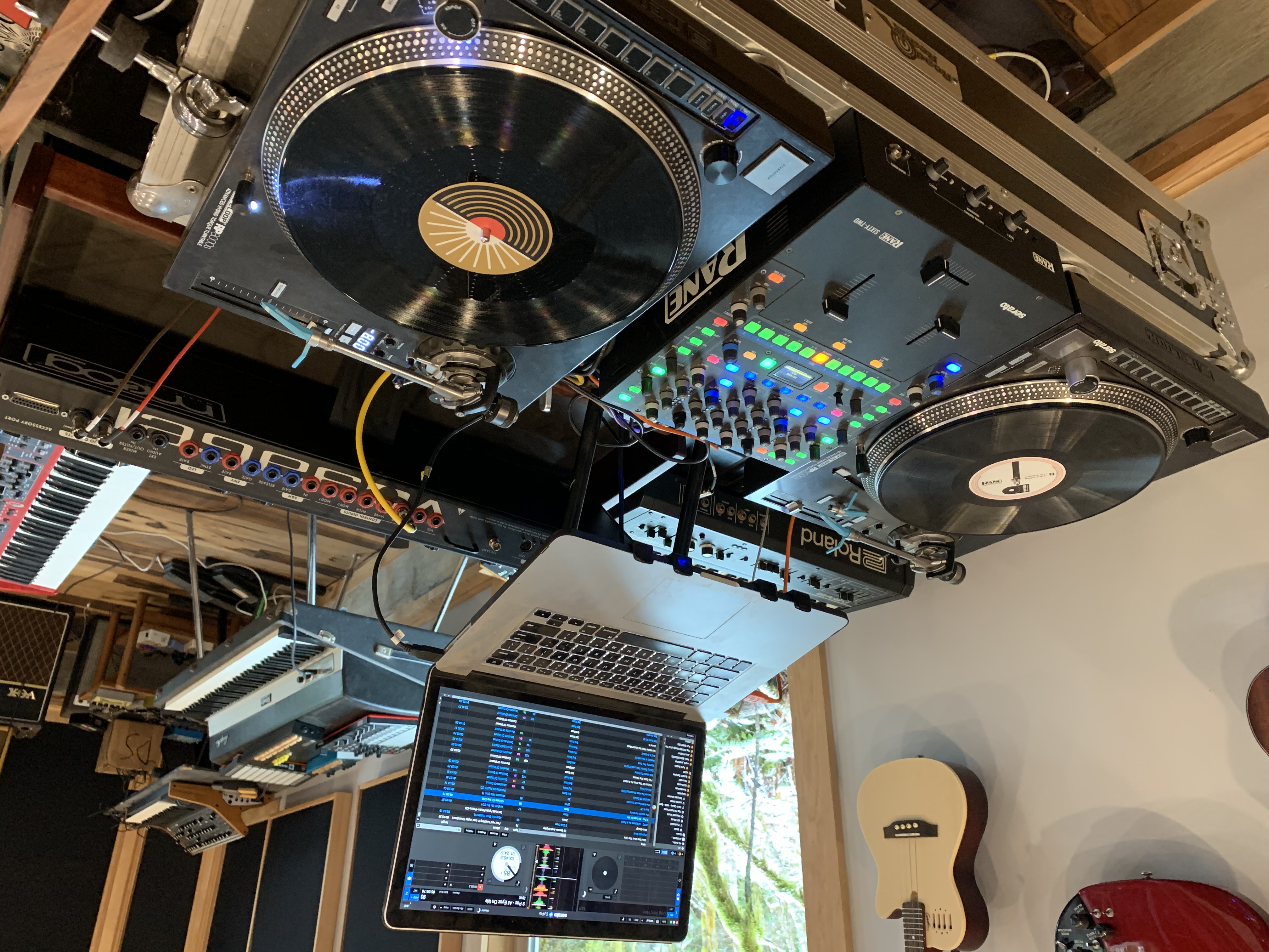 DJ/Sampling station: This is where I source snippets of sound from my vinyl collection or CDs ripped to WAV and then cued up in Serato DJ Pro.
