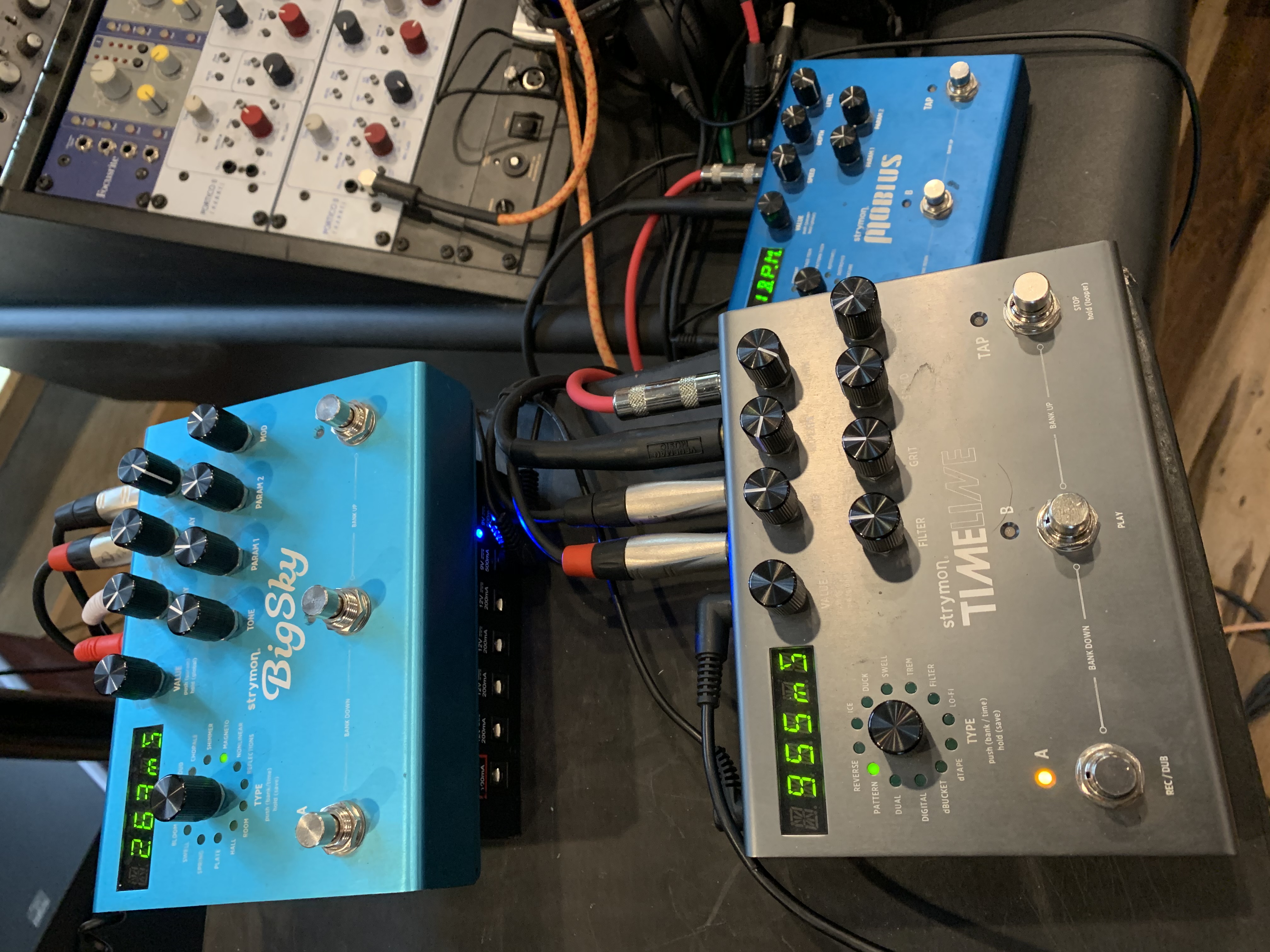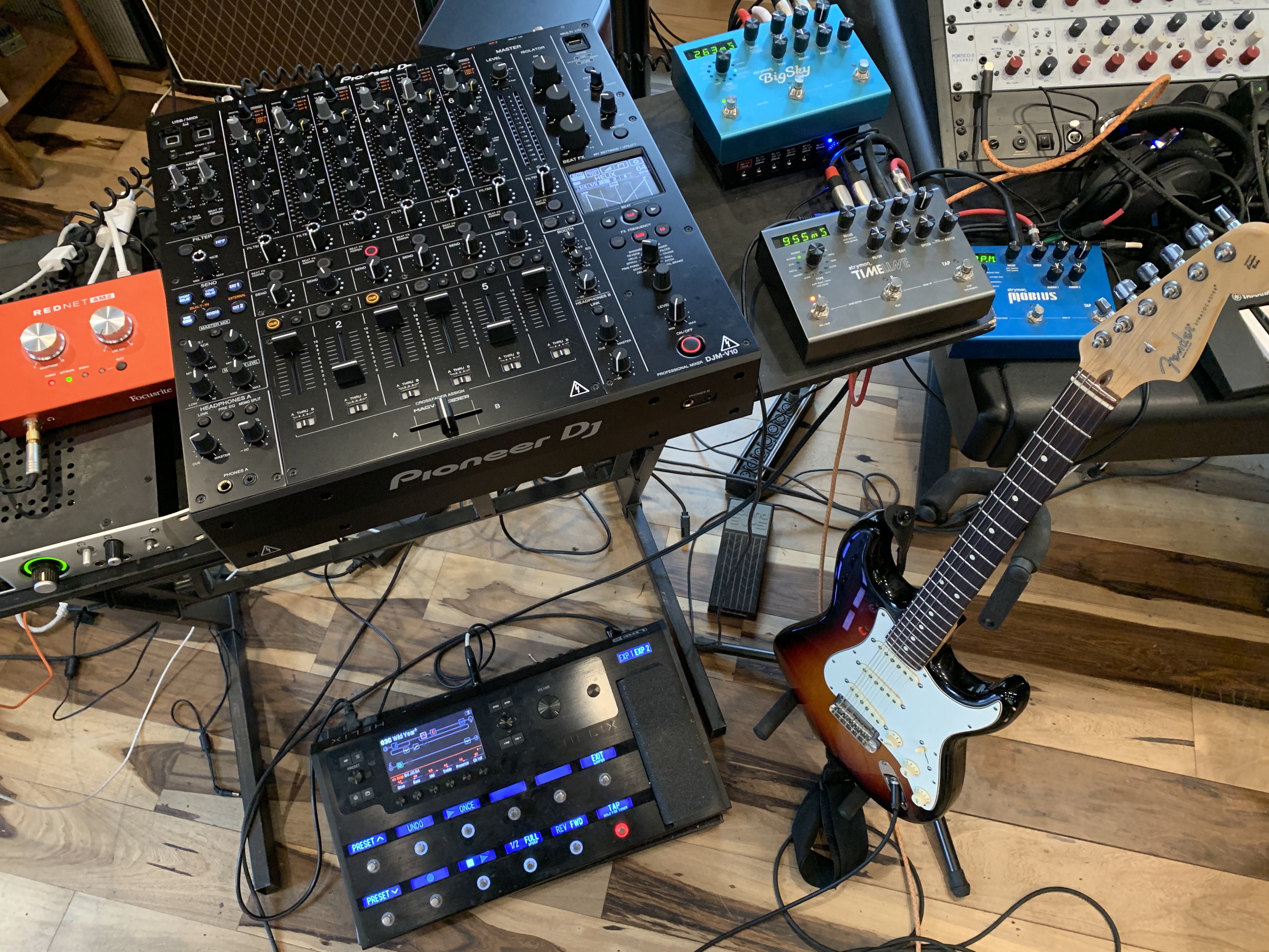 Guitar recording station: Fender Stratocaster, Line 6 Helix Floor, Strymon Big Sky Reverb, Strymon Timeline Delay, Strymon Mobius Filter & Pioneer DJM-V10 Mixer.