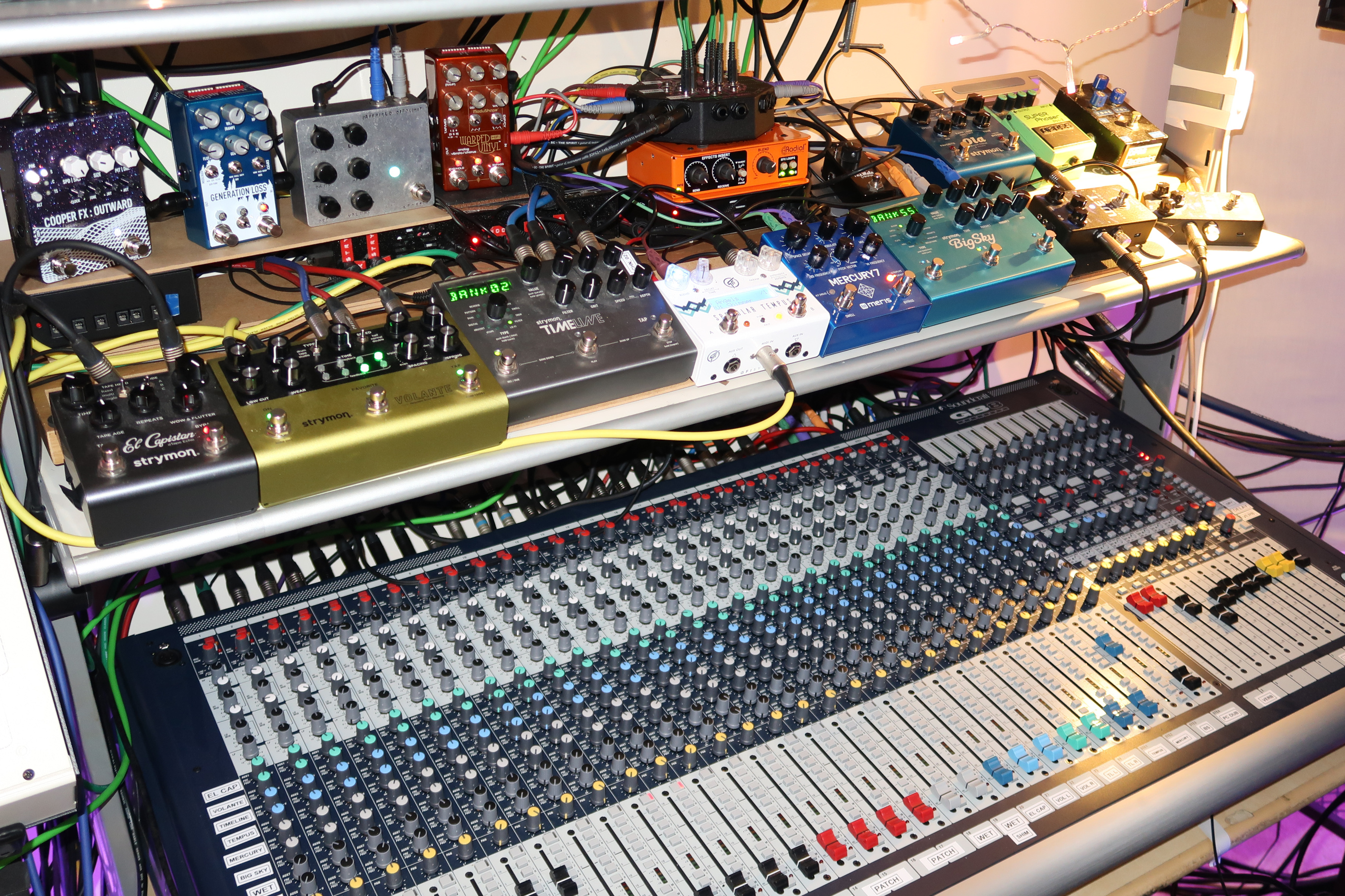 I also use a lot of pedals as inserts on the dry synths. The Radial EXTC-SA allows me to have 2 different chains and easily adjust the dry/wet blend and the gains going to the pedals. This is connected to the Boredbrain Patchulator 8000, so it’s easy to switch up the order of pedals and get quite experimental with things. I have things like the Cooper FX Generation Loss, Fairfield Circuitry Shallow Water and Chase Bliss Warped Vinyl permanently plugged in as I use them so much, but generally will swap out other pedals quite regularly.
