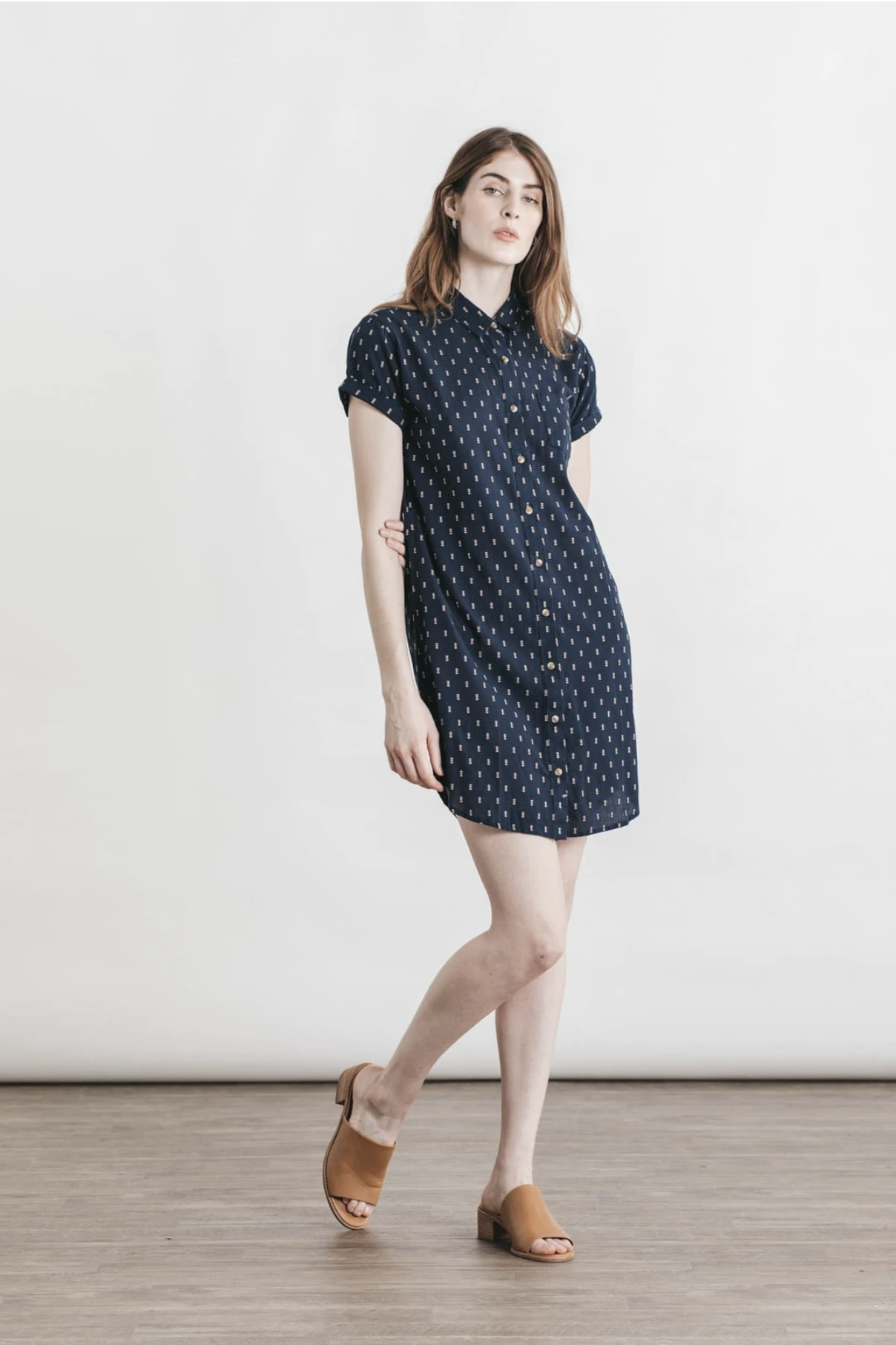 The Loren is a classic button-front shirt dress in airy cotton dobby that offers breathability and incredible softness. Utilitarian details include cuffed sleeves and a single chest pocket.