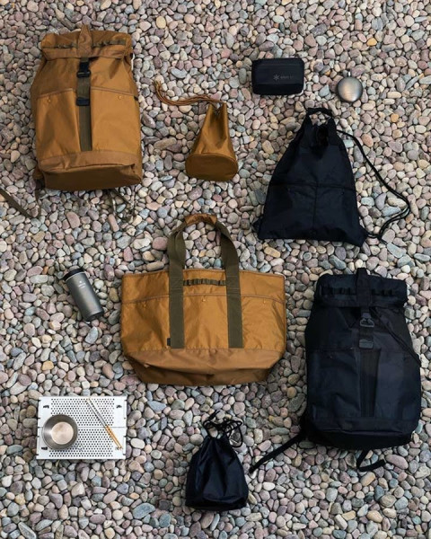 The bags combine sleek Japanese design with a highly technical fabric. The bag was developed by sailcloth makers who discovered that the material used to create ultralight racing sails could be used for standard consumer items. The bags are waterproof and resistant absorbent. The bags come in tan and black.