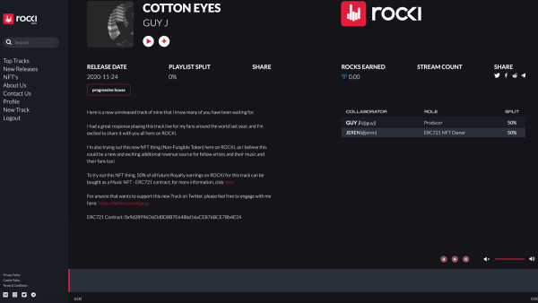 Guy J – Cotton Eyes track on ROCKI showing the new 50% Royalty NFT owner: