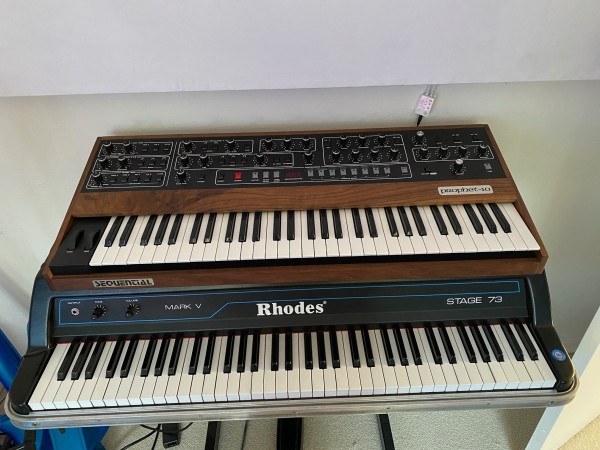 Arguably the synth everybody has been waiting 40 years for, so nice to have one that doesn’t come with repair anxiety and a nice keyboard with tight midi and is able to receive pitch and mod messages, etc, pictured here on top of a Rhodes MKV, time travel back to 84 except maybe if it was 1984 it would be a DX7 instead.