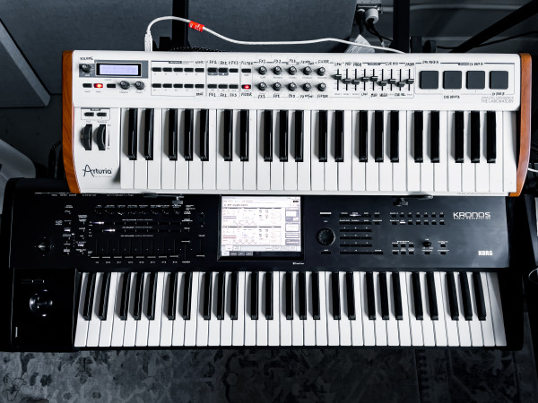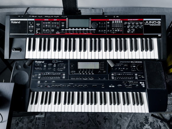 On the opposite side of my Kronos, I have my two Rolands: the Juno G, and the EM-2000. The Juno I got a few years ago and I love it. It doesn’t have just the typical Juno sounds, there are a lot more sound-designed presets as well. I use it for pads + textures. The EM-2000 was my dad’s arranger from the early 2000s. He was a live musician and got this one shortly after we moved to the US from Serbia. It’s the keyboard I learned how to play piano on, and to this day it has some of my favorite piano and Rhodes sounds ever. Every time I play it, a wave of nostalgia comes over me and makes me feel like a kid again. It’s been in storage for years, but I dug it out in October when I got COVID and was bored in my house for 2 weeks. I’ve been using it in my setup since then, and it provided the synth chords for “L.U.V.,” as well as the Rhodes on “How Long Have You Been Away?” & “More Than I Love You.”