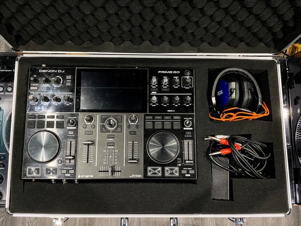 For our case (below), we took our Denon Prime Go, our M-200 V-Moda headphones and power supply and cables for the fitting. Now we can easily port everything we need inside one hard case, which can even double as small table to place your rig on.
