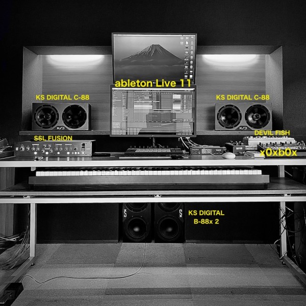 This space is the master studio for everything from pre-production to mixing. I’m running Ableton Live 11 on a Mac Pro 2017, and the interface is analog to SSL’s AWS900 via FOCUSRITE’s REDNET. From there it goes through FATSO + SSL FUSIO, back to the SSL AWS900, and then back to Ableton for mixing. The monitors are KS DIGITAL C-88s with B-88 subwoofers.