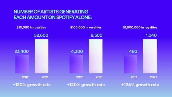 In 2021, Spotify paid out $7 billion to the music industry, according to the streaming service. Over 1,000 artists generated $1 million, though not all of that money went to the artist. There was a 120% increase in catalogs that generated $10,000 in revenue for rightsholders on Spotify alone, from 23,400 to 52,600.