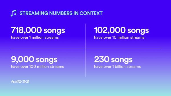 There are loads of songs generating quite a bit of money. 718,000 songs have surpassed a million streams, while 238,000 songs received a million streams in 2021 alone. Over 230 songs have even reached a billion streams.