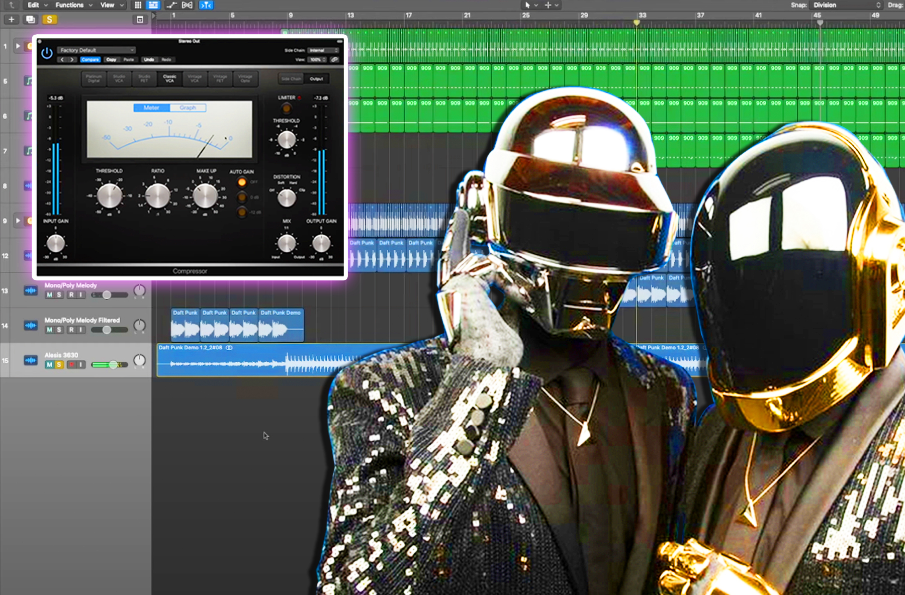 Using the Alesis 3630 Compressor, this technique was made famous over a decade ago by Daft Punk and other French house artists. The pumping sound is created by using the kick drum to trigger the compressor, making the other elements in the track duck out around it. This is especially great for kick-heavy tracks, as it keeps this element prominent in the mix.