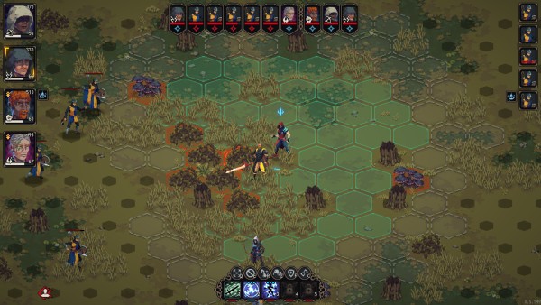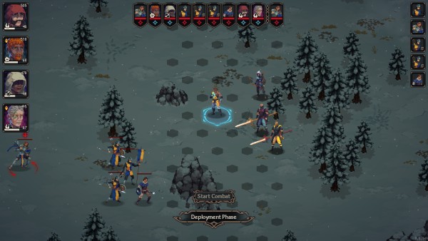 Assuming you don’t get ambushed, you are given the opportunity to choose from a limited number of tiles on the battlefield to place each member of your squad of 4 mercenaries before the first turn takes place.