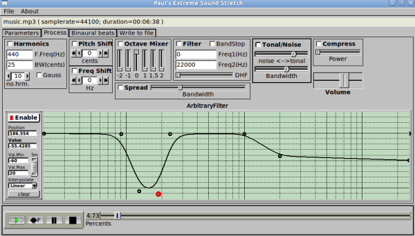 This provides you to stretch samples in such a length that they become soundscapes itself. A good example is the slower version of Radiohead’s Pyramid song (800% slower).