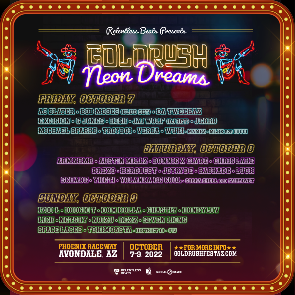 Relentless Beats has announced phase 02 of its Goldrush: Neon Dreams lineup, taking place October 07-09, 2022, at Phoenix Raceway, 20 minutes from Downtown Phoenix.