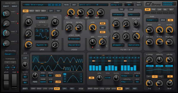 The Spire polyphonic synthesizer is available for PC/Mac in 32/64 bit formats. It has four oscillators with multiple processing modes (Classic, Noise, FM synths or Hard FM, AMSync, and SawPWM). It can use up to nine times unison for each oscillator. There are several modes from which to choose. Two multi-mode filters with several types on its onboard processor.