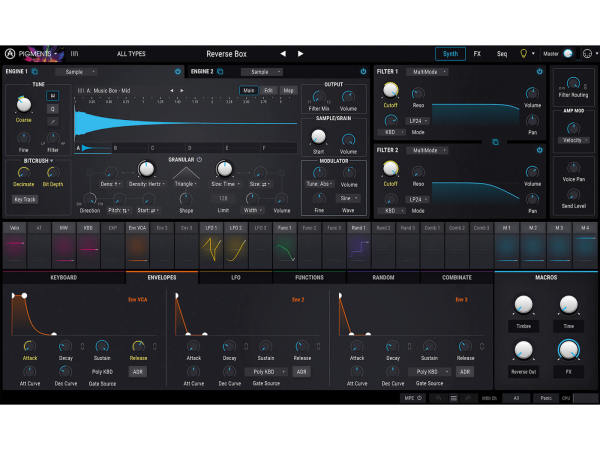 The instrument’s Waveshaper and multi-mode Filter give it the ability to create analog-like sounds, such as searing filter sweeps, growling distortions, and harmonically-rich resonances.
