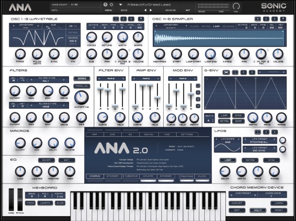 ANA 2.0 is a software synthesizer that has been completely redesigned with a new black GUI, HD Retina-ready graphics, and compatibility with almost every operating system. The sound is generated by a combination of three wavetable oscillators and three sample-based oscillators.