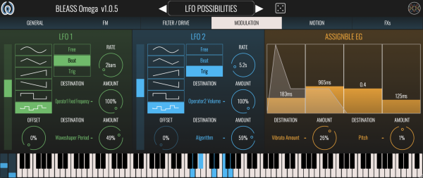 This is a great accomplishment for any FM synth! Omega’s blending of digital and analog sensibilities, as seen in its library of nearly 200 patches, creates a synth sound that is unique and full of personality.