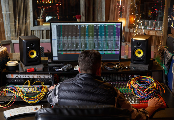 In a good room, you can use the KRK App and an SPL meter to get a proper monitor setup―with the speakers in an equilateral triangle, equally spaced from each other and you. Don’t have everything against one wall in the room or the exact middle of it because that’s a point where things cancel out. The KRK App can also help ensure your monitors are in-phase.