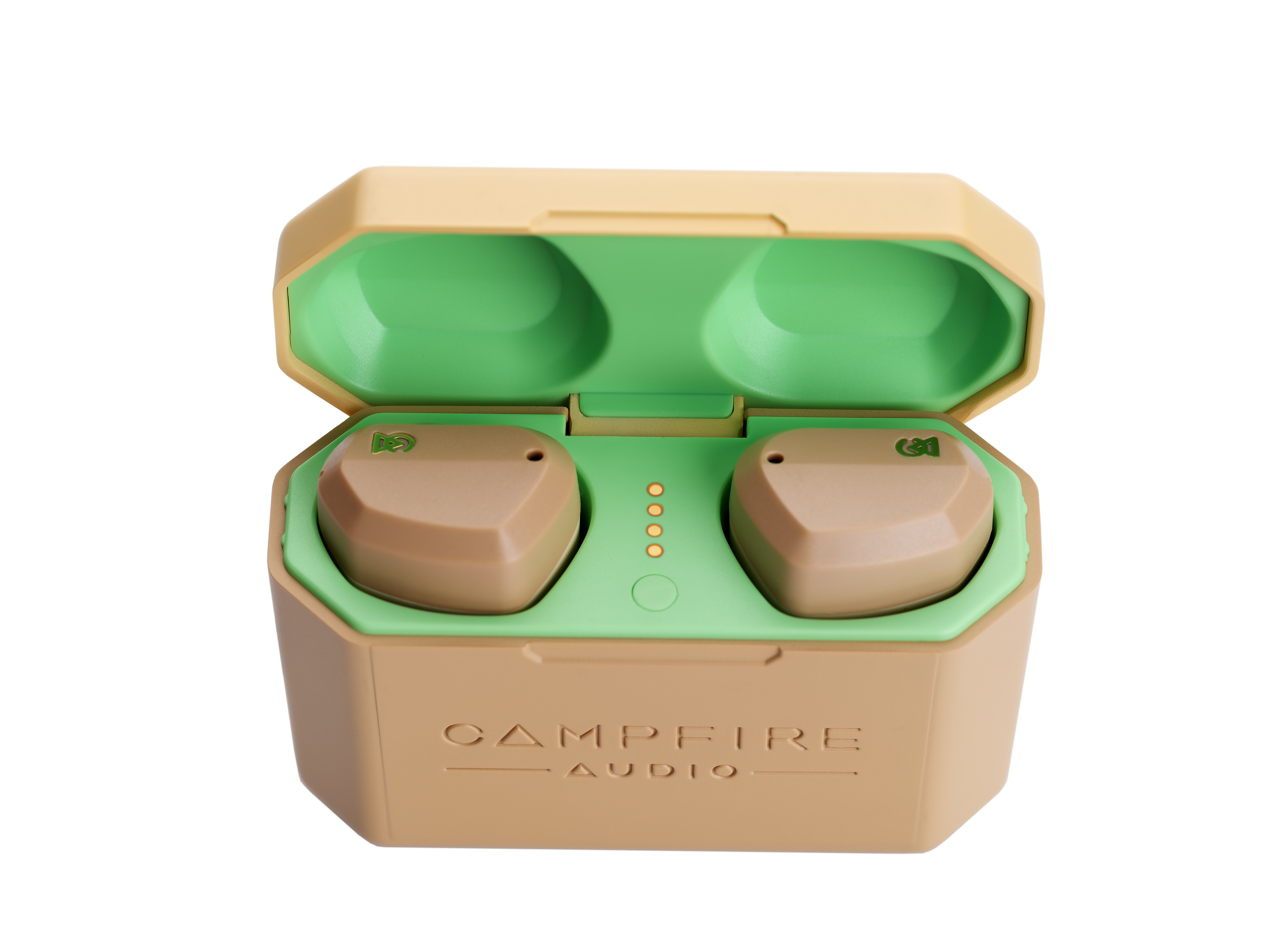 The first thing you’re gonna notice when you get these little guys out of the packaging is the matte beige color scheme, which I think will be the most polarizing thing about this product. The case is made of plastic with a quality feel, the same as the buds themselves (besides the stainless steel drivers). Inside the case is a striking lime green. I personally don’t mind the look. I think it makes them earthy and modern which fits Campfire Audio’s Pacific Northwest aesthetic, but I understand this is subjective.