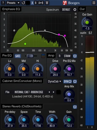 Voxengo Boogex is a free guitar amplifier simulator that’s also great for bass. It offers a range of cabinet simulations, including several classic amps, and allows you to customize the tone with adjustable parameters such as gain, treble, and bass. It’s a great way to add a warm and rounded tonality to basses of all kinds to give them a light analog quality and out-of-the-box vibe.