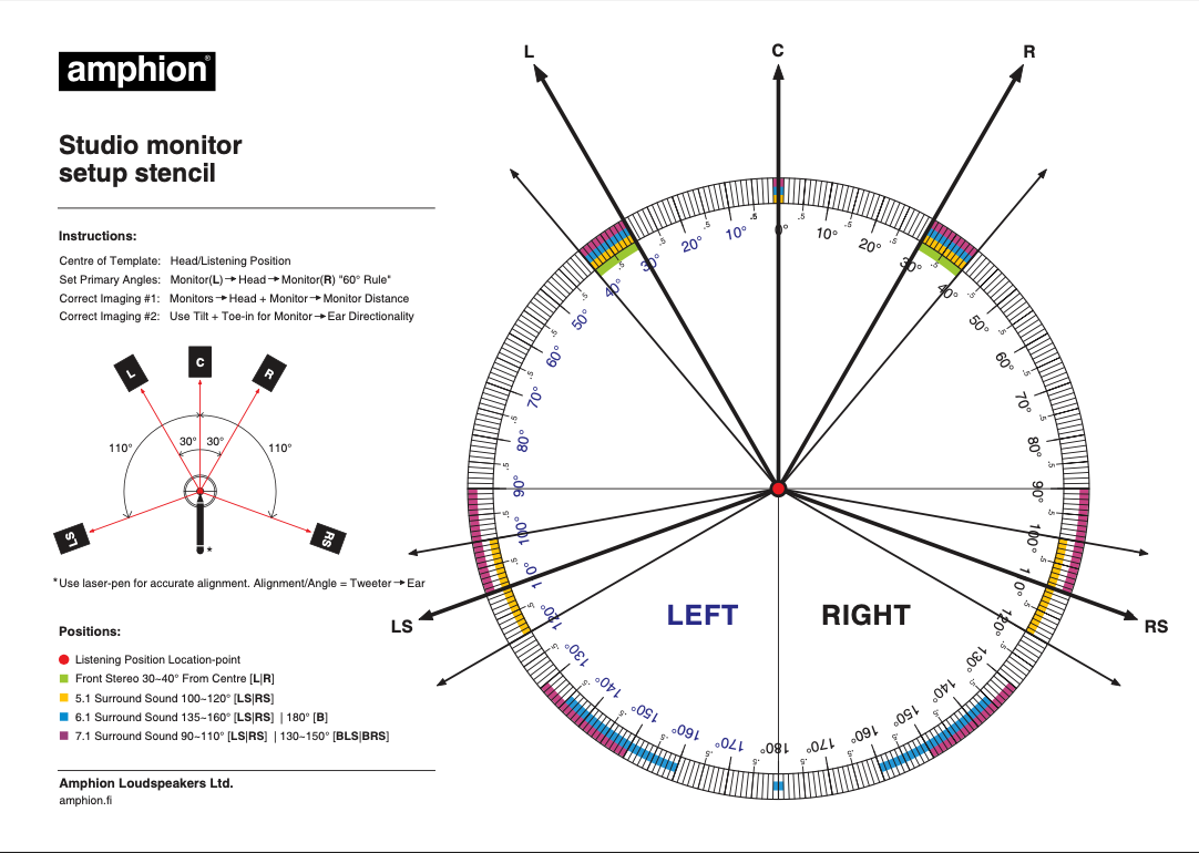 A correct imaging is only possible when the speakers are placed symmetrically about the listening place. Especially in the studio, precise speaker positioning is essential. As the stencil shows, the acoustic center point of the speaker should be pointing to the ears so that you can hear all the frequencies correctly (the highest treble is always directive, which means that you will miss some of it in case you do not aim the speakers directly to your ears).