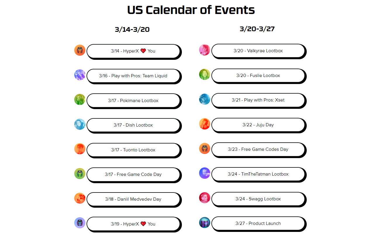 From March 13 to the 27th, everyone will have the chance to join in on cool events, discounts on HyperX gear, limited releases and free loot drops. Be sure to check on the event calendar link here.