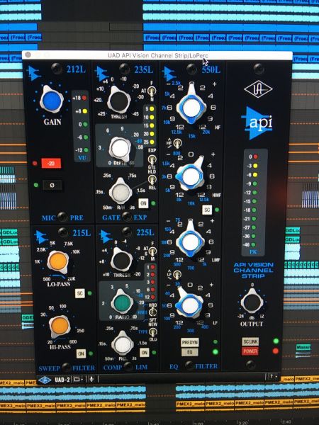 We’re going to switch gears here to the final mix and premaster. Each mixdown I make has 6-7 (usually 6) mix busses. A typical setup is one for kicks and subs, one for midbass or acid, one for low percussion like snares, one for high percussion like hats, one for leads, and one for auxiliary synths like pads or vocals or FX sound design. In the original arrangement, I place an API Vision Channel on each mix bus. On the kick and bass, I’m just working compression, and on the rest of the tracks, I am just working EP. This emulates running all my mix busses through an API mixing desk. A real, original API desk is hard to find for under 100k dollars. This isn’t all of one, but it’s as close as I could get to the desk I learned how to mix on in engineering school at Arlyn Studios (Sublime and Butthole Surfers’ go-to studio in Austin).
