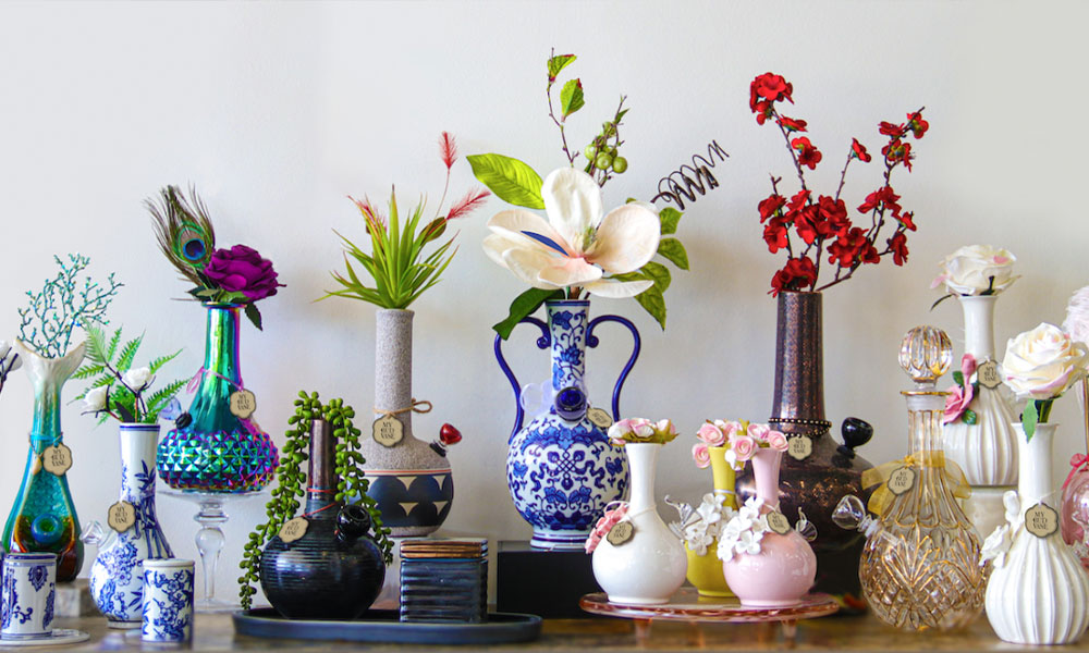 I opened the door to a carpenter saying hey can I get into your attic to check on the roof? I let him in while my heart was pounding out of my chest. When he left, I went over to my floral fortress. It was such synergy that my bong was hidden next to a vase that was shaped like a bong. That’s when I had the Ah-HA moment. The very next day, I started collecting vases to figure out how to make them into beautiful and functional smoking devices.