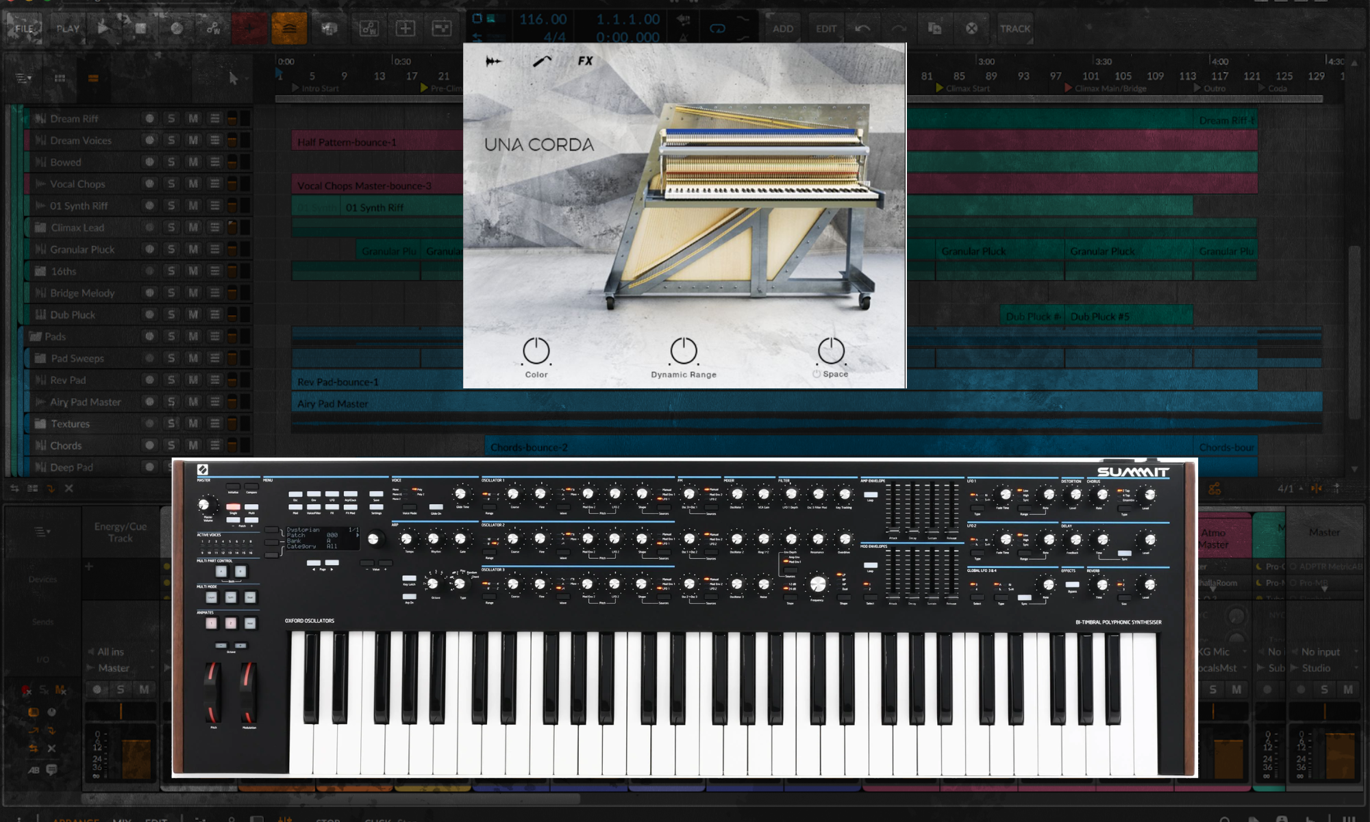 For this song, I used two sawtooth waves, slightly detuned from each other, to create a warm, pad-like base for the lead. I added some subtle distortion and delay from the Summit to give the layered sound more depth and character, making it sit well in the mix. The Una Corda sound is a bright upright piano sound with an almost refined lo-fi sound, so the Summit layer had to complement that sound to give it the spotlight. The flexibility of the Summit is incredible.