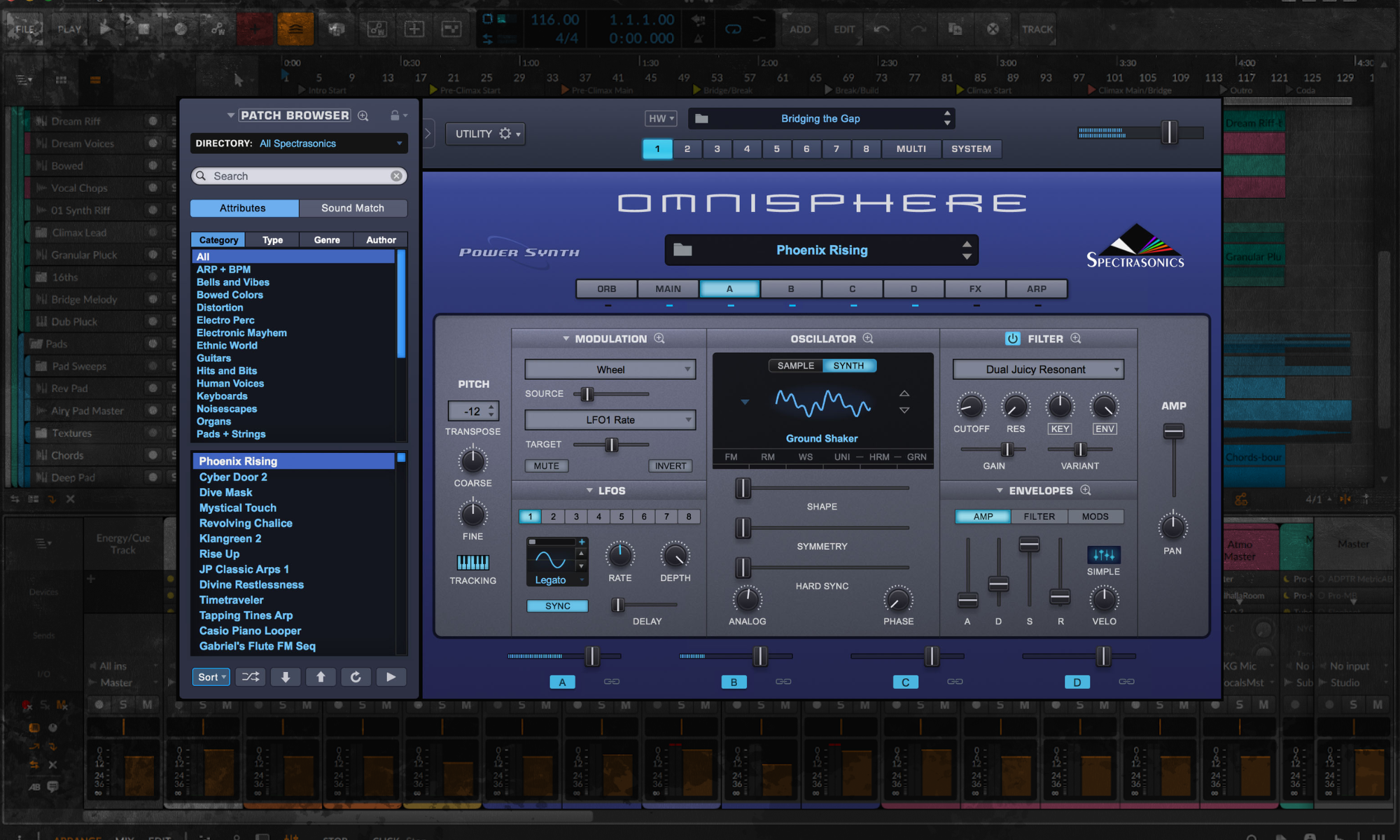 I used Omnisphere to create these layered pads. It has a great library of sounds and lets you combine them in different ways. A lot of the onboard samples are very unique – burning pianos, whale sounds, you name it! This is perfect for building complex, atmospheric textures.