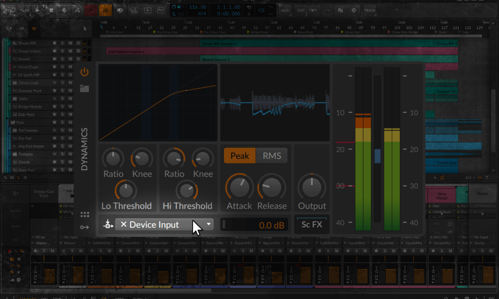 That’s why I created a custom tool in Bitwig called the Multi-input Sidechainer. It streamlines the ducking process by letting me manage all the ducking controls in one place. Essentially, it allows me to set up individual ducking for different frequency ranges of the background sounds based on different instruments.