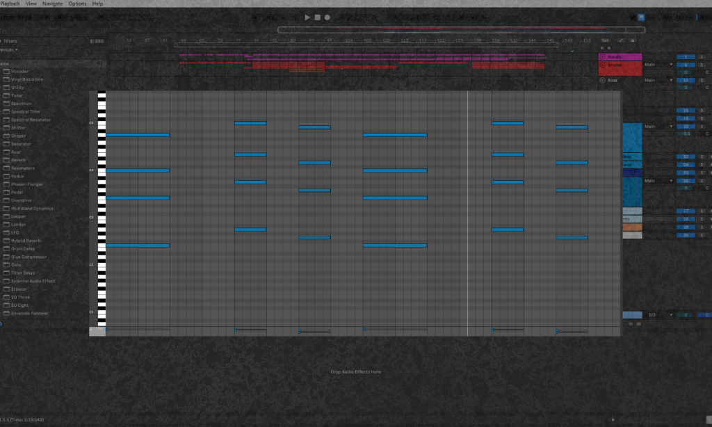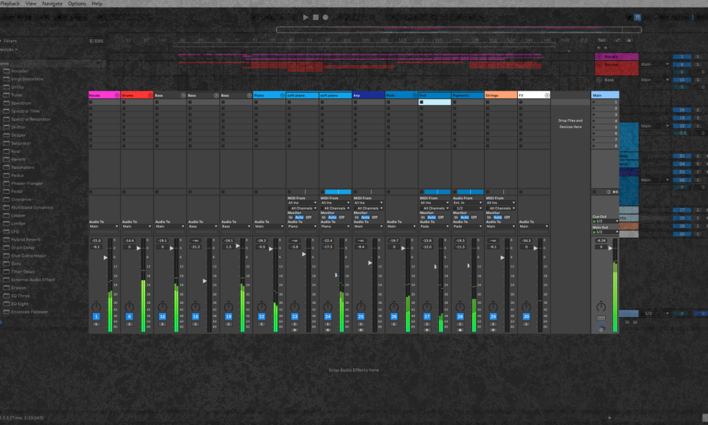 We used Pigments for all of the synth chords and pads on this record. We tend to have dedicated sound design sessions where we will build out about 40-100 presets in a given instrument group and save the ableton rack with all the creative out of synth plugins included in the preset. In doing so all of the automation is pre-built to macro knobs allowing us to write one lane of automation that changes 5-10 parameters in one go.