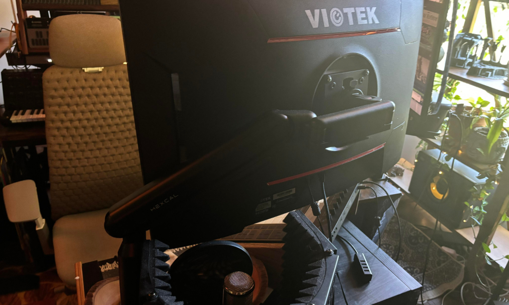 The Hexcals monitor arm does this ideally and is a fantastic addition to my studio. It holds up my second monitor, which I use as my virtual mixing board in Ableton when I’m working or as my second monitor playing Netflix while I unwind playing games at night.
