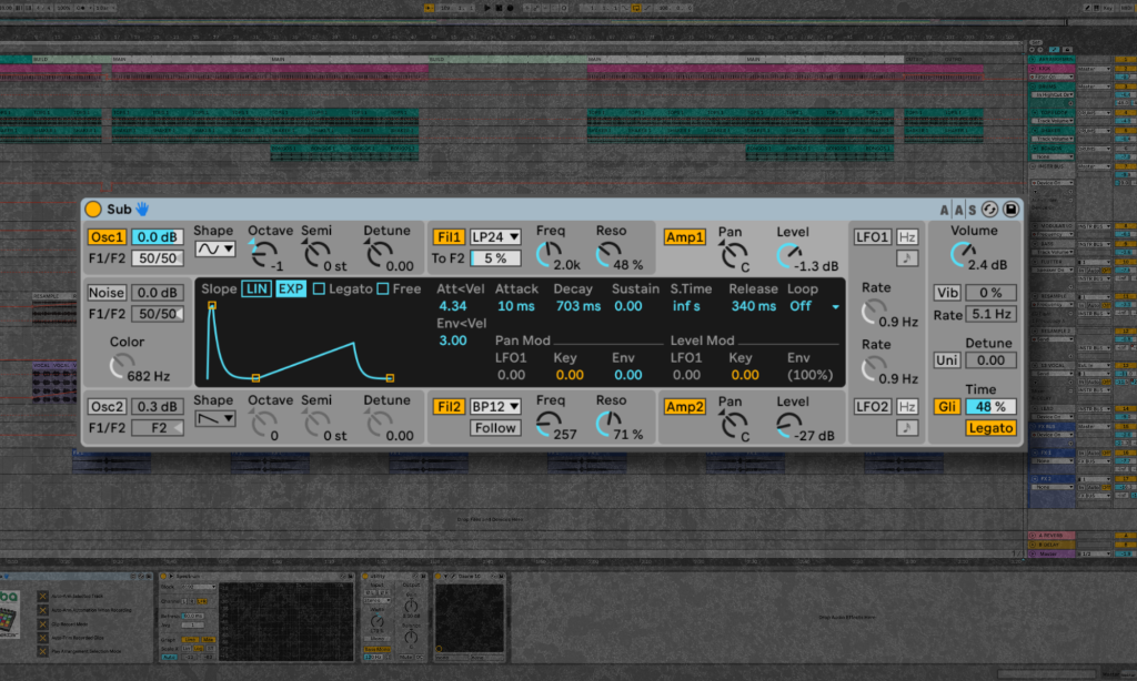 Next came the bass. I wanted a simple subby bassline to avoid distraction from the main brass/string loop and the other harmonic elements around it. Despite often using my Novation Peak (hardware) for subs, I opted for Ableton’s amazing stock VST, Analog. The bassline shifts the brass loop’s home key, giving it a new tonal centre of F minor.