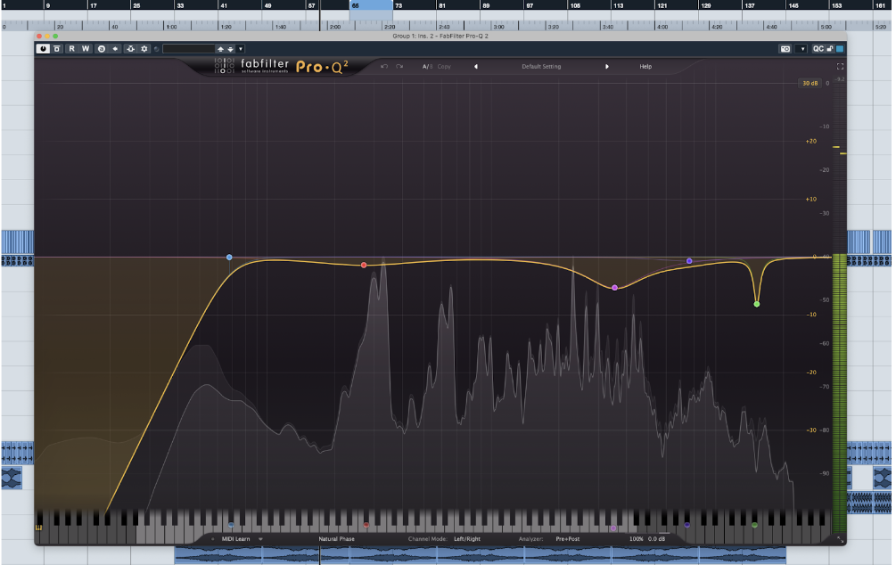 First plug in goes Fabfilter Pro-Q2. With it I fix resonance frequencies.